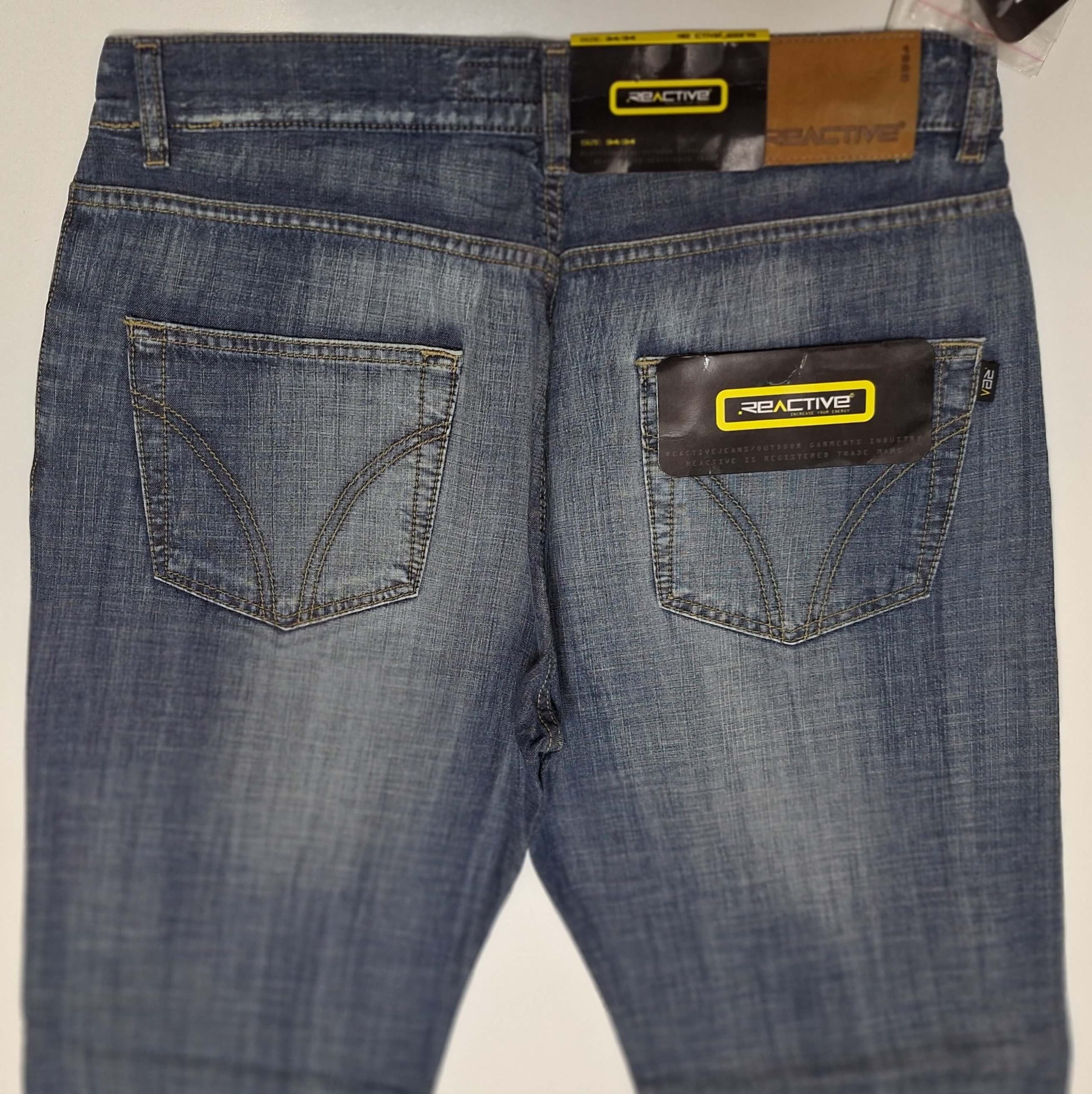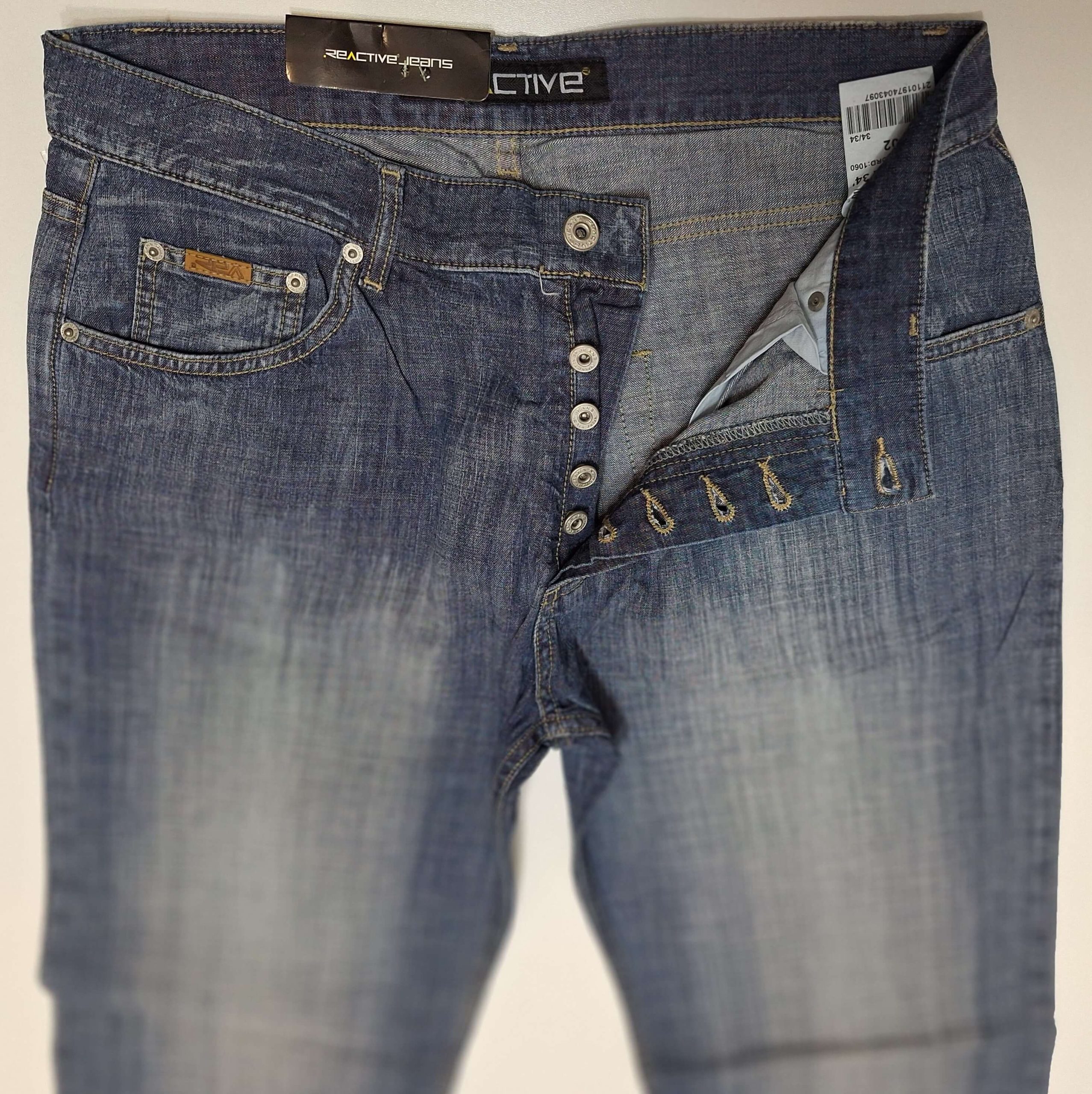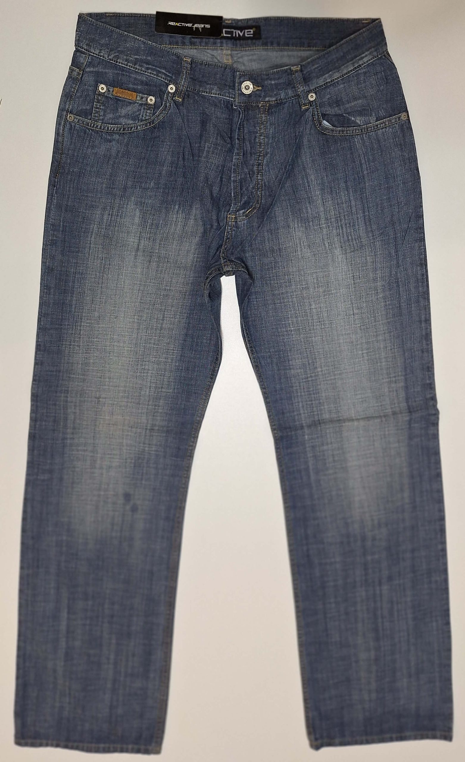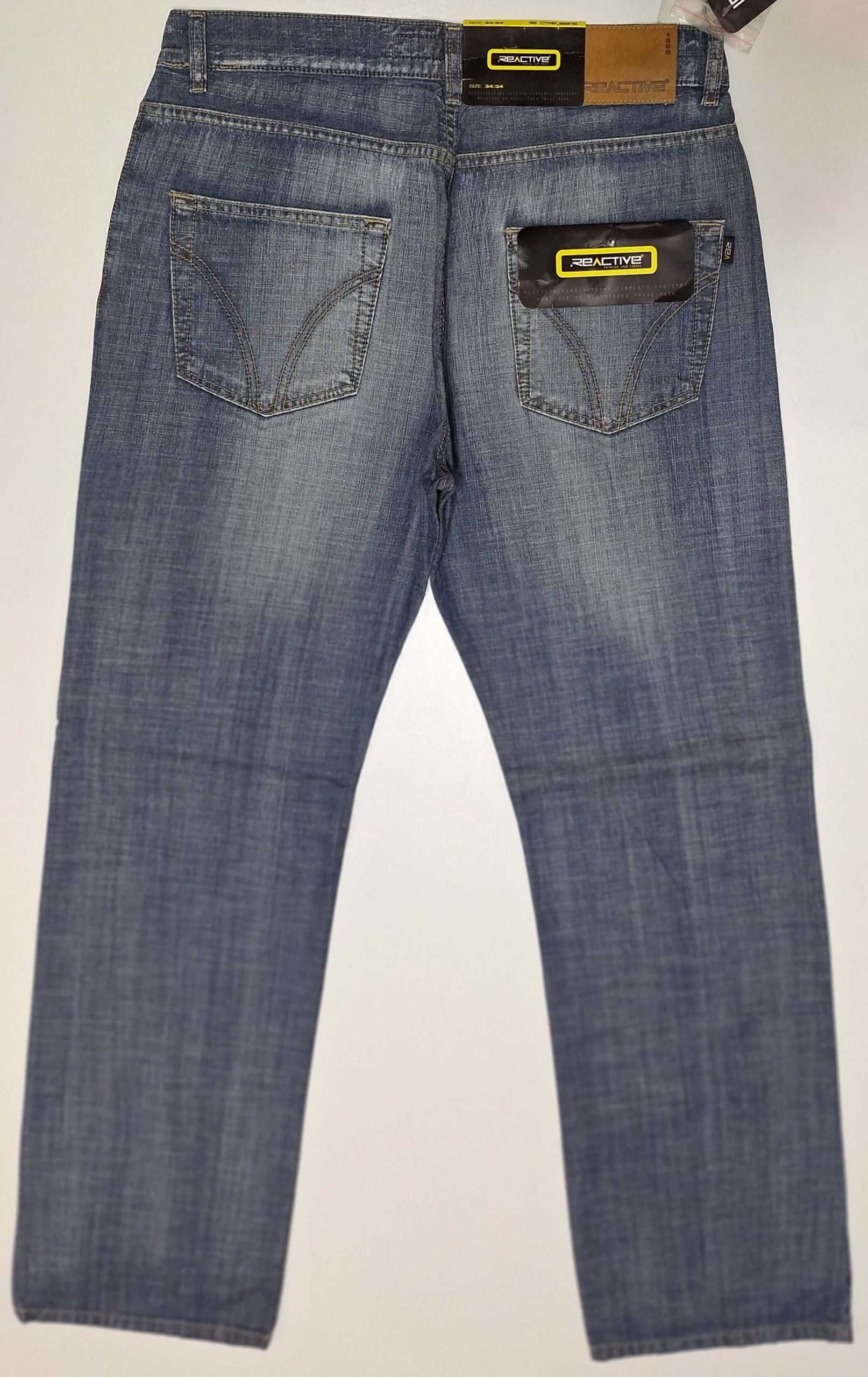 Spodnie męskie firmy Reactive, proste szerokie nogawki, kolor mocno sprany niebieski, rozporek zapinany na guziki, materiał to bawełna 100%.
