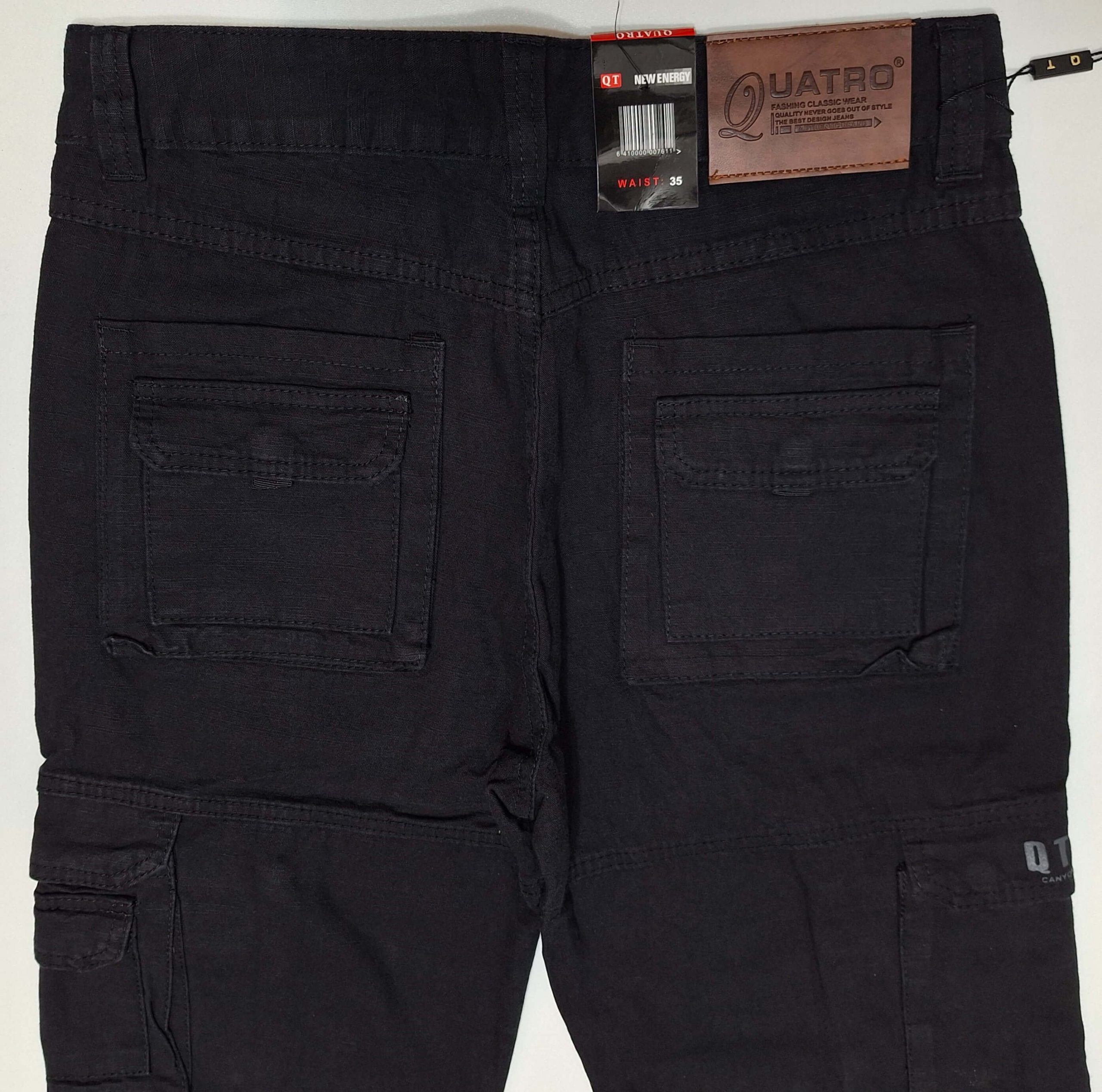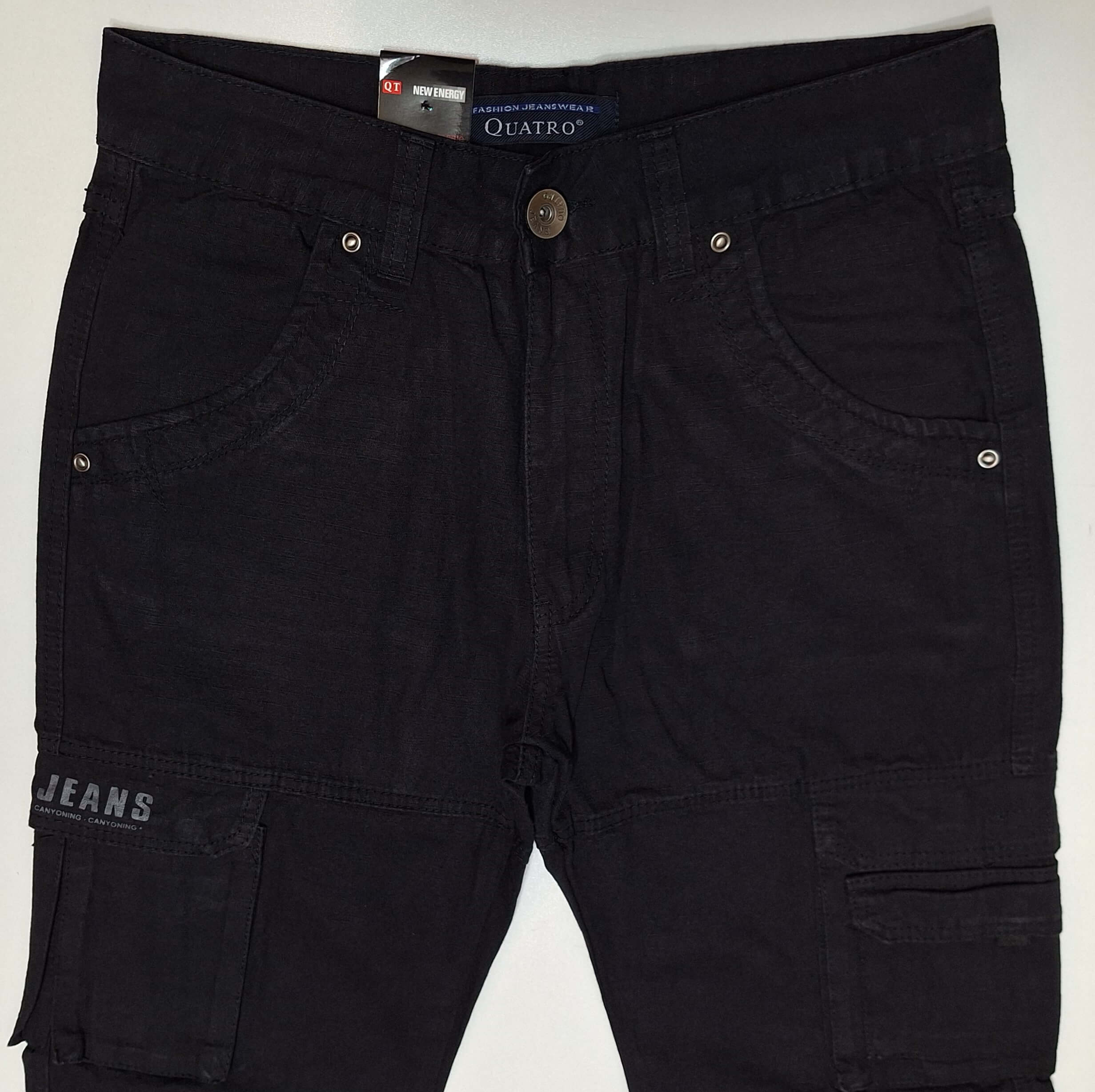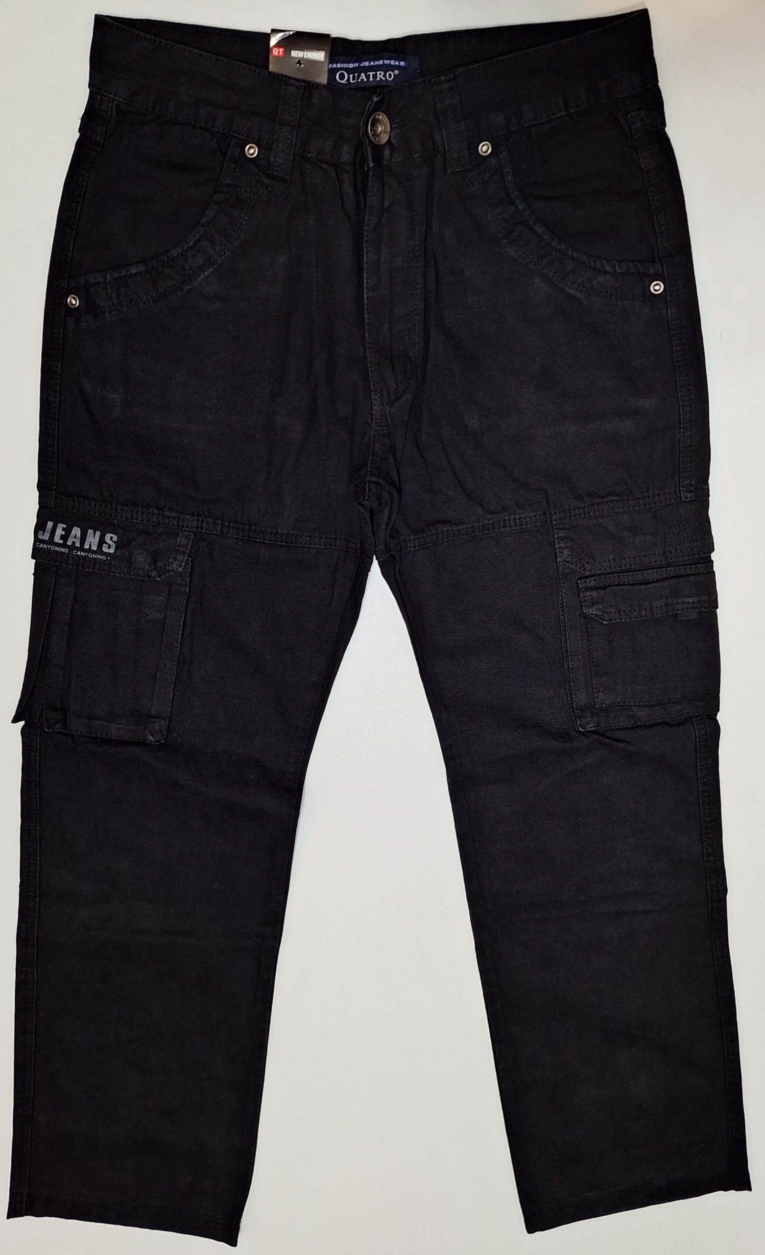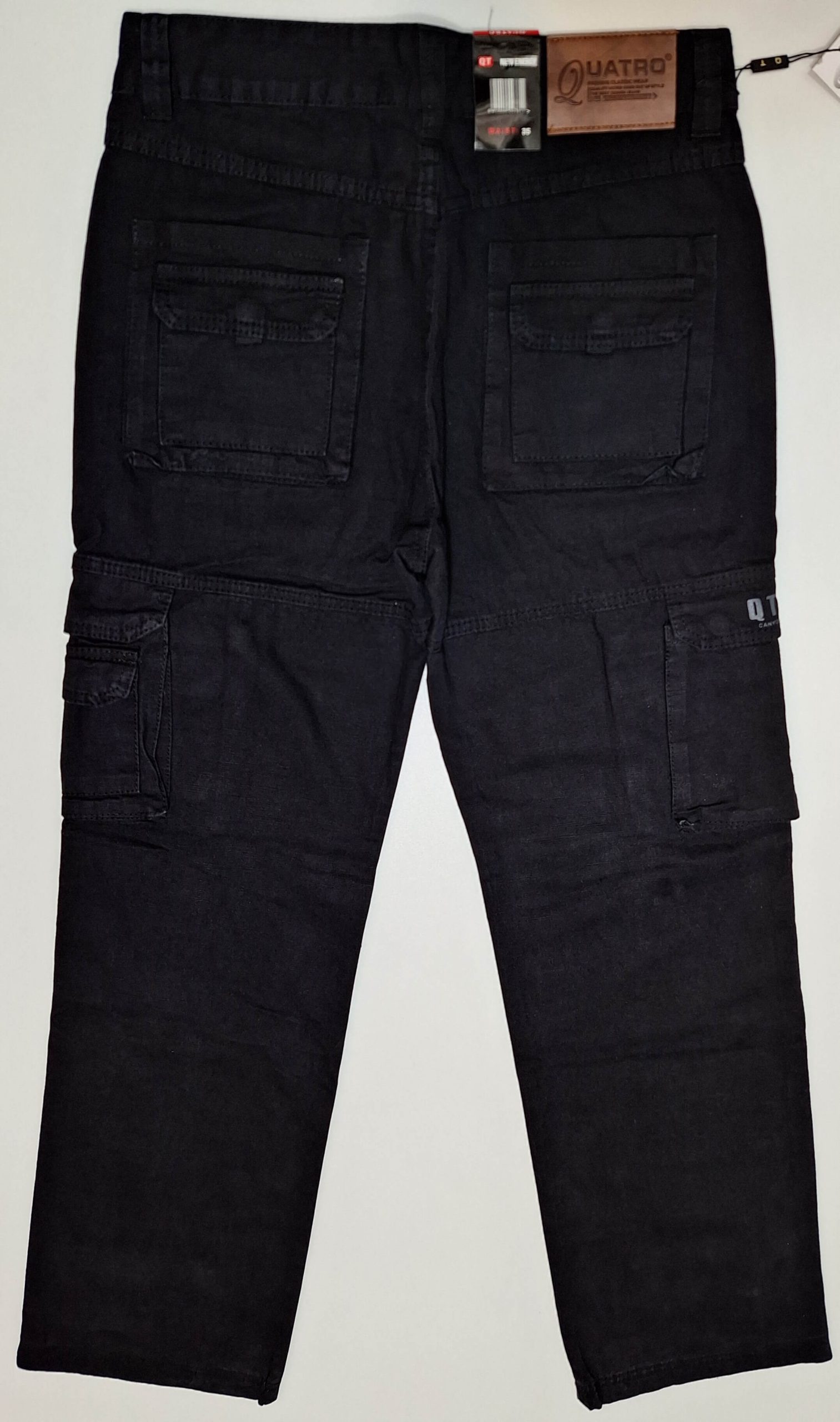 Spodnie męskie bojówki koloru czarnego firmy Quatro, prosta szeroka nogawka, materiał to 100% bawełna (nie są elastyczne).