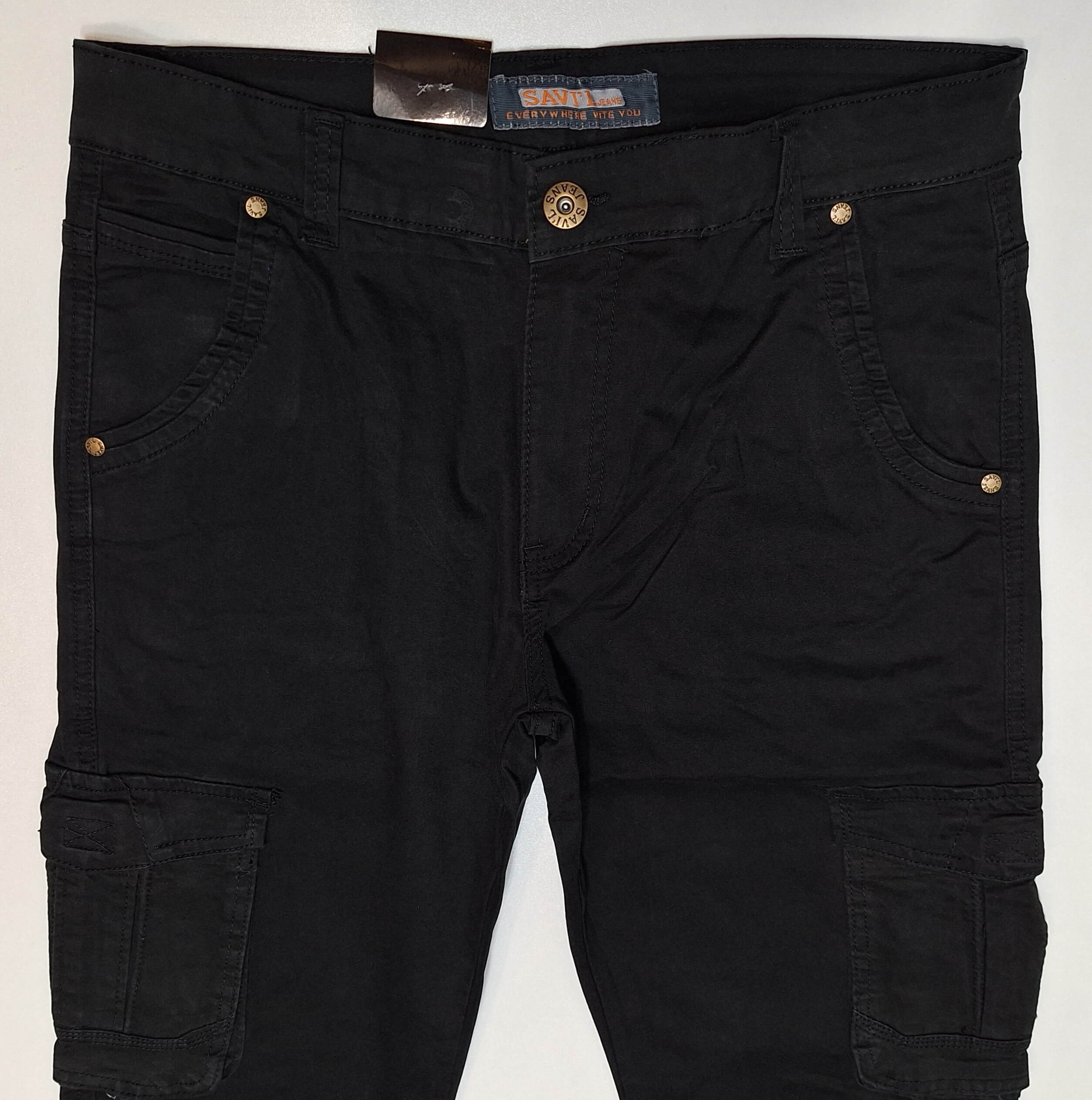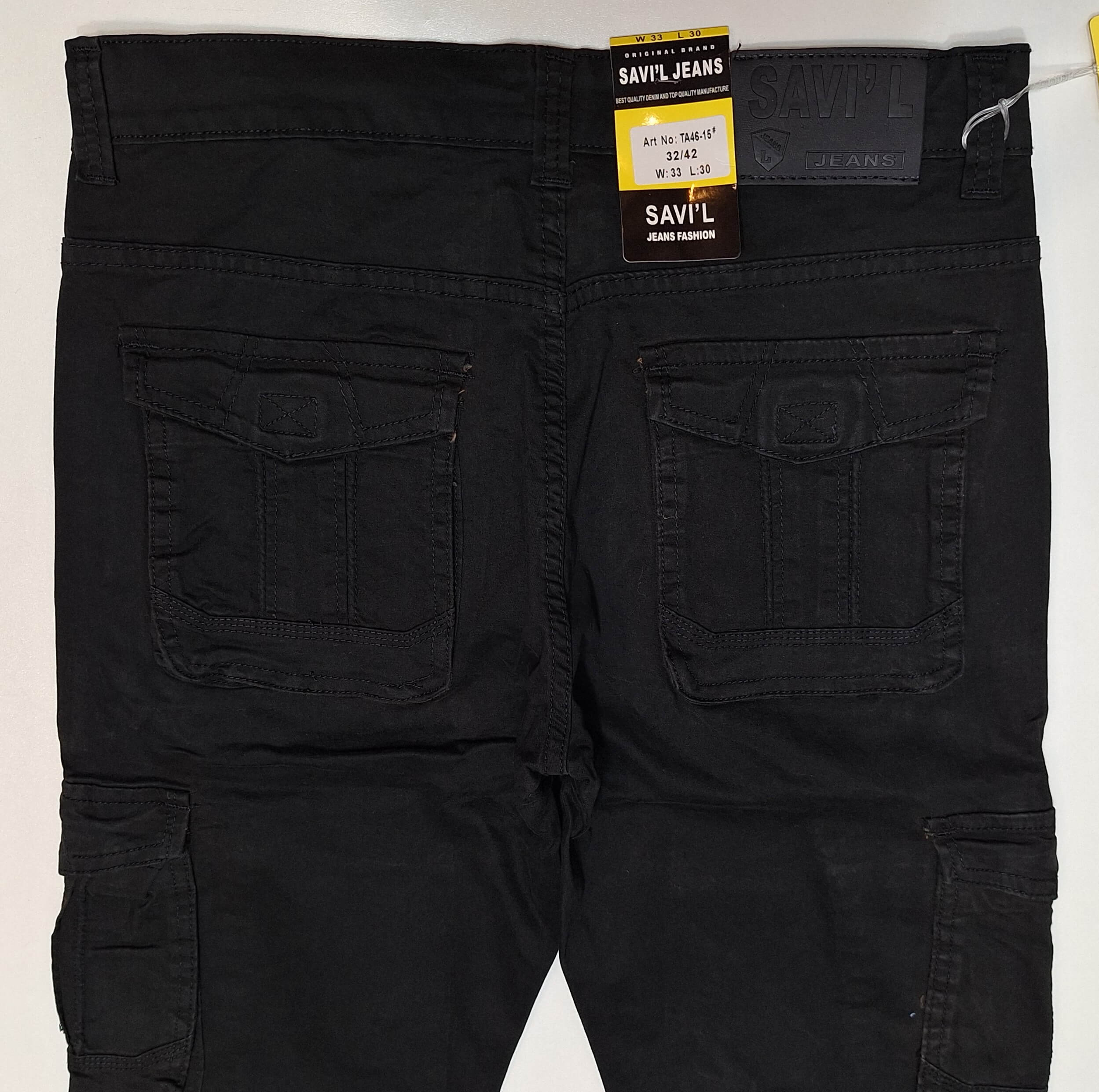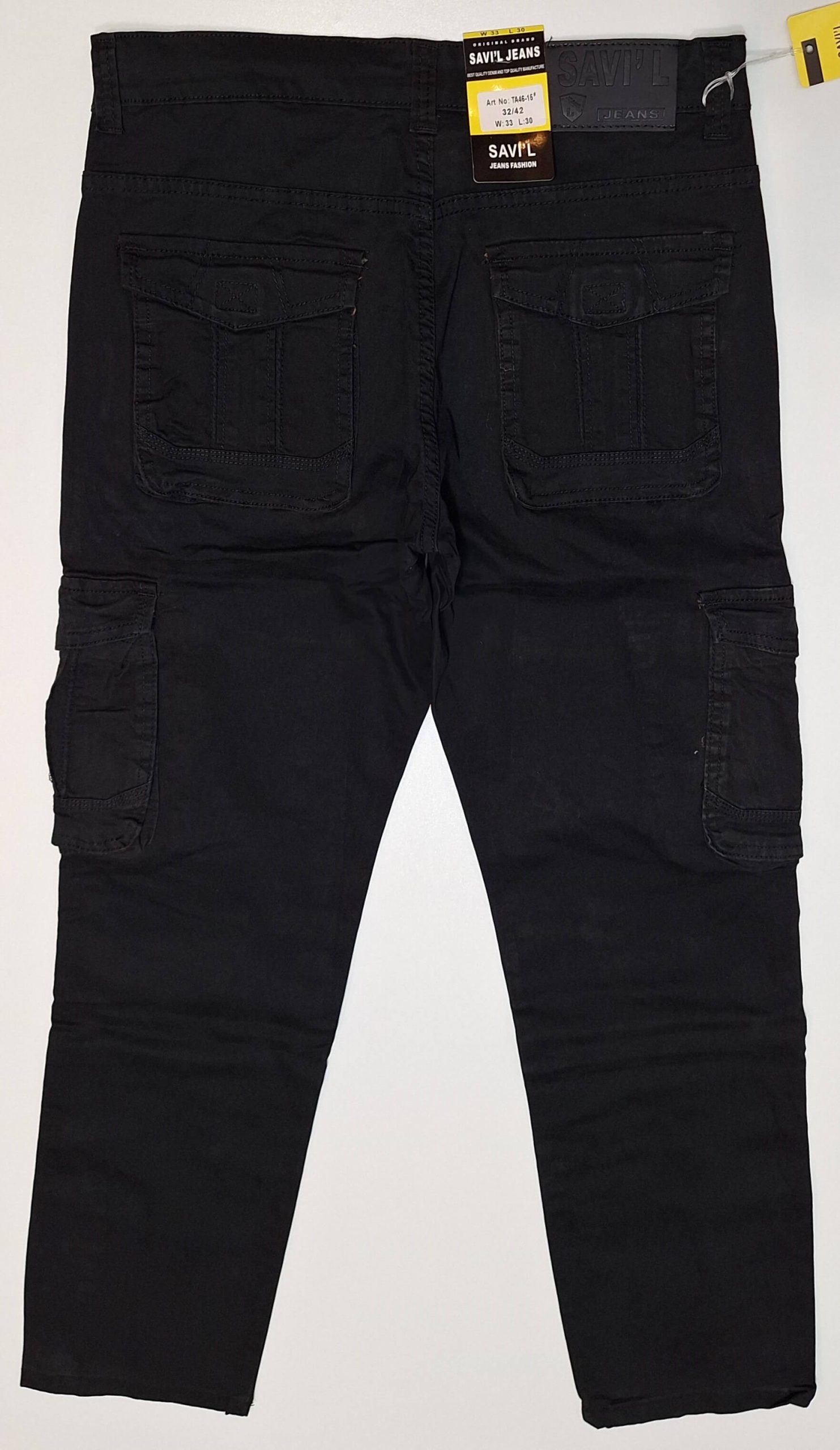 Spodnie bojówki firmy Savil koloru czarnego, prosta dość krótka nogawka (długość 30 cali). Materiał elastyczny, skład materiału to 70% bawełna, 24% polyester i 6% elastan.