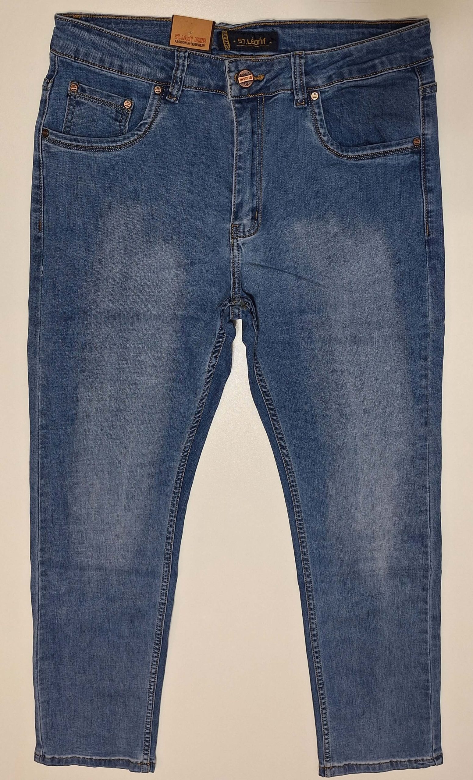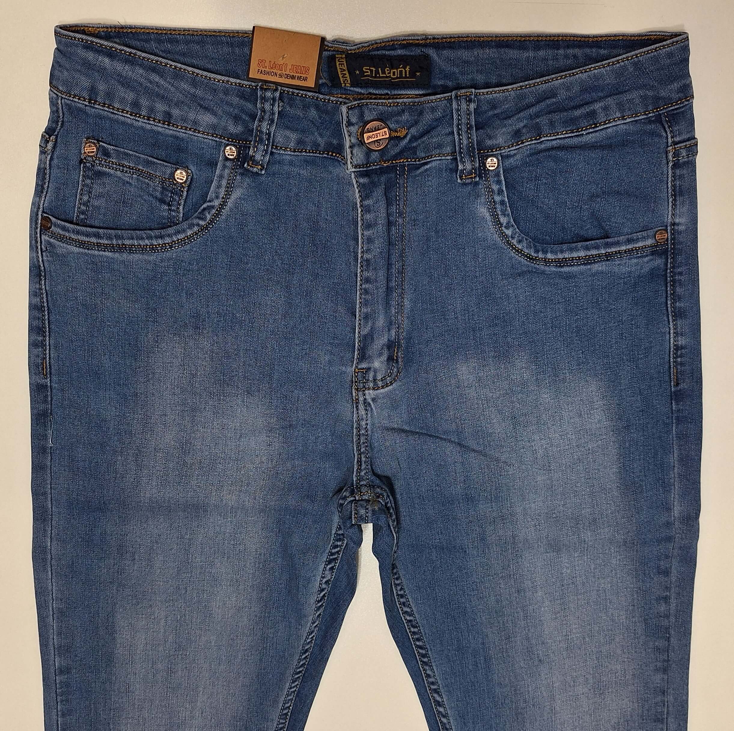 Spodnie jeansowe męskie firmy St Leon, prosta nogawka, jasne niebieskie dekatyzowane, materiał elastyczny. Długość nogawek tylko 30 cali, około 77 cm. mierząc od kroku.