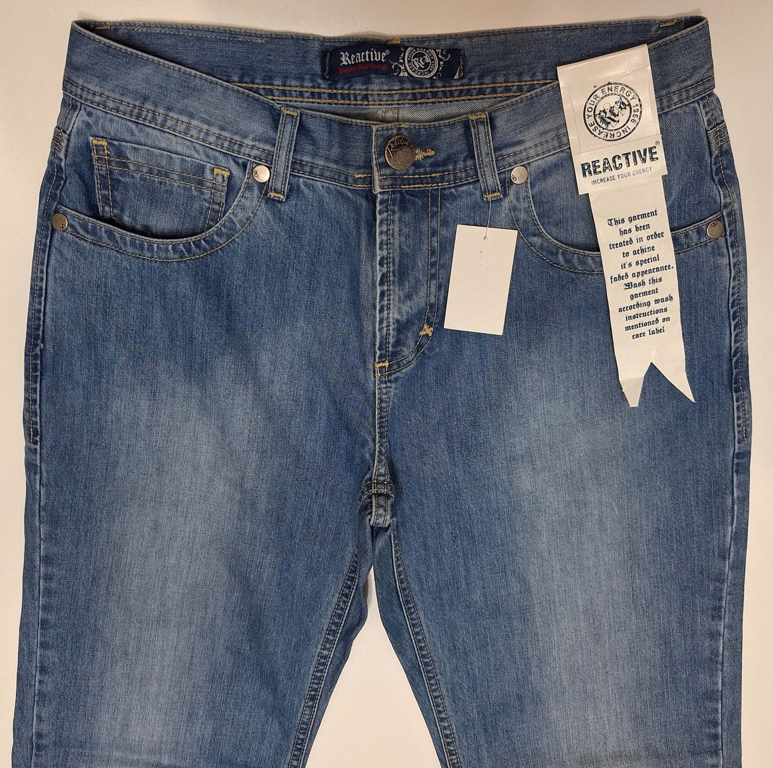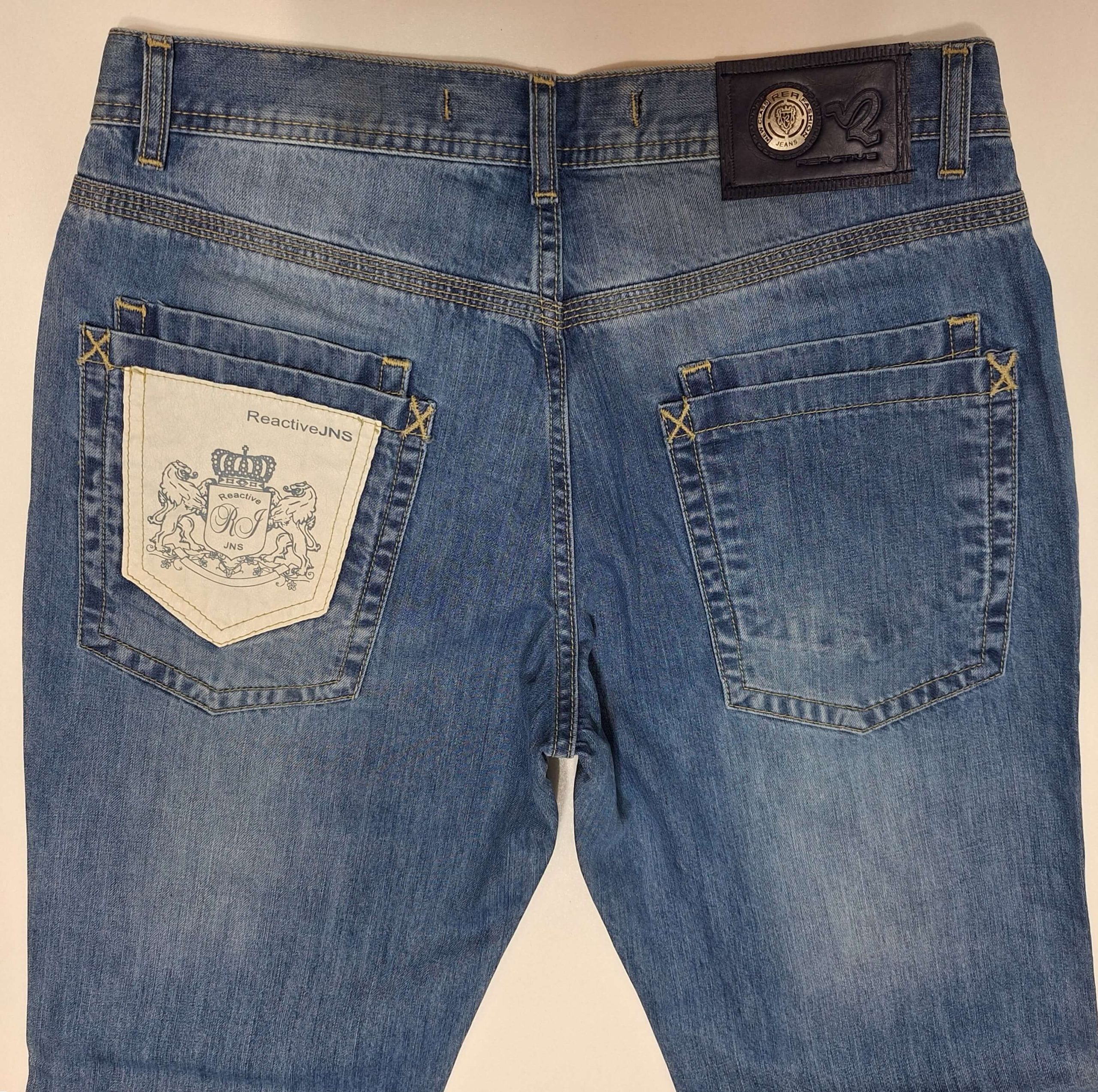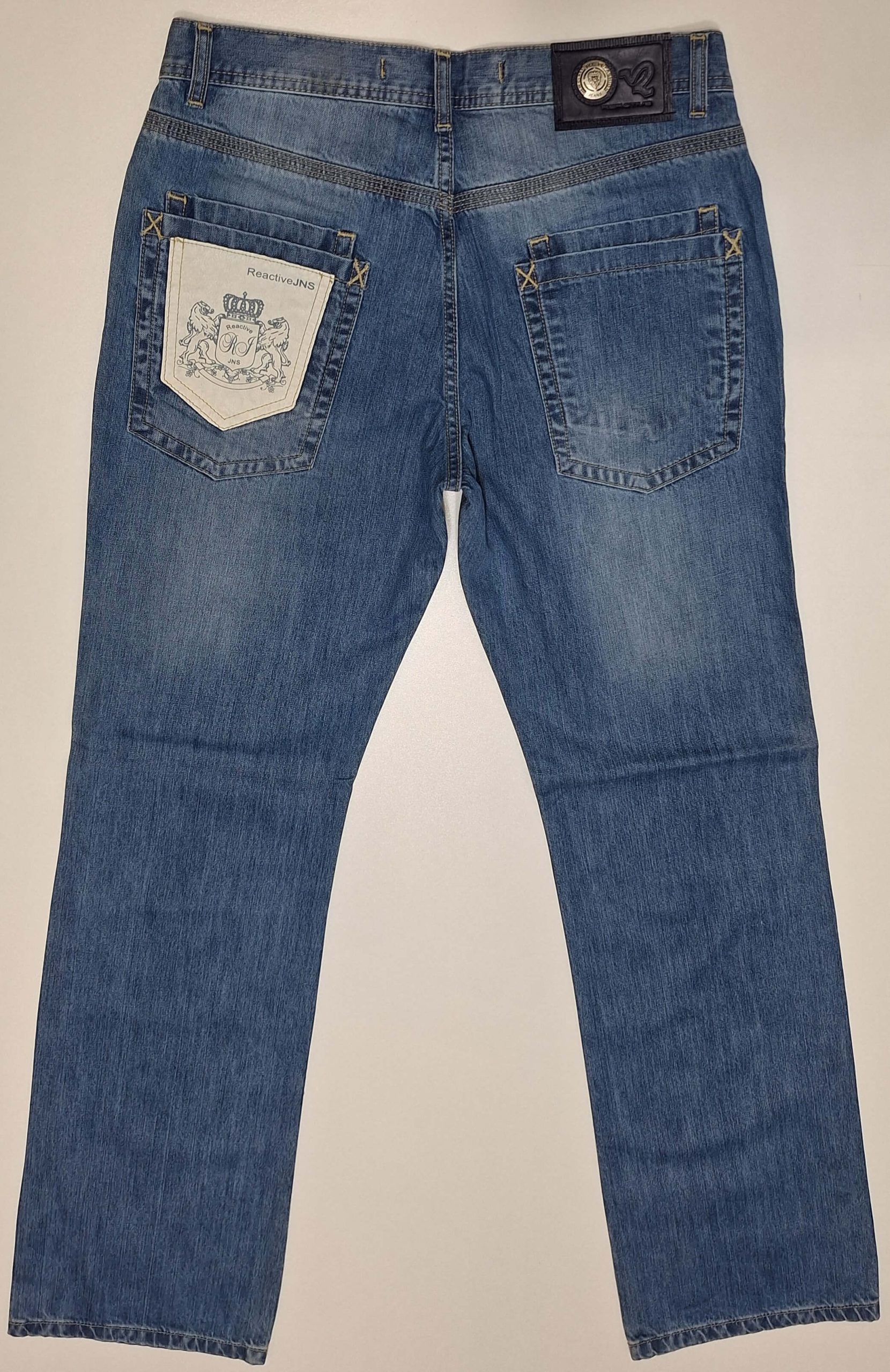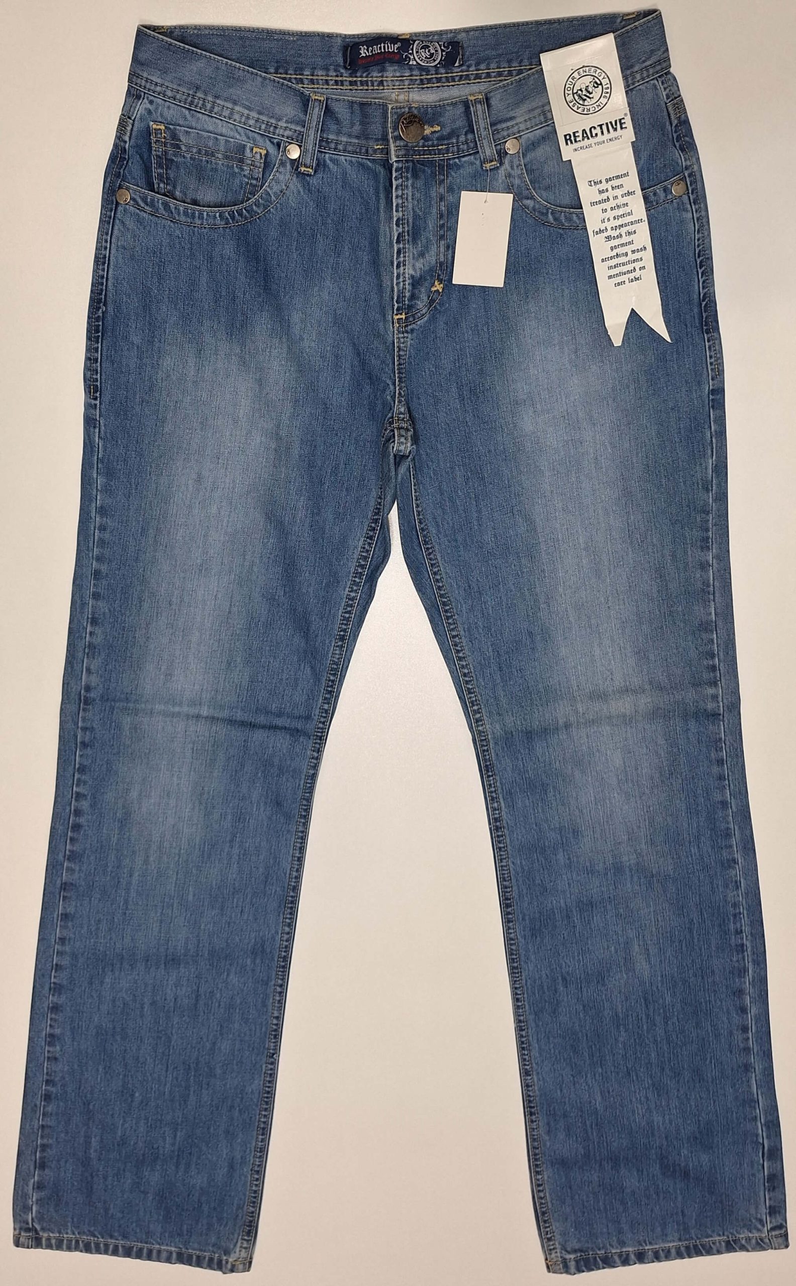 Spodnie jeansowe firmy Reactive, model męski (patrz wymiary), prosta nogawka, niski stan, materiał przecierany, rozporek zapinany na zamek, solidna bawełna 100% (nieelastyczne).