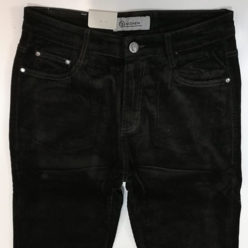 Spodnie sztruksowe firmy Qizhen, prosta nogawka, materiał elastyczny, wąski prążek sztruksu, kolor ciemna zieleń.